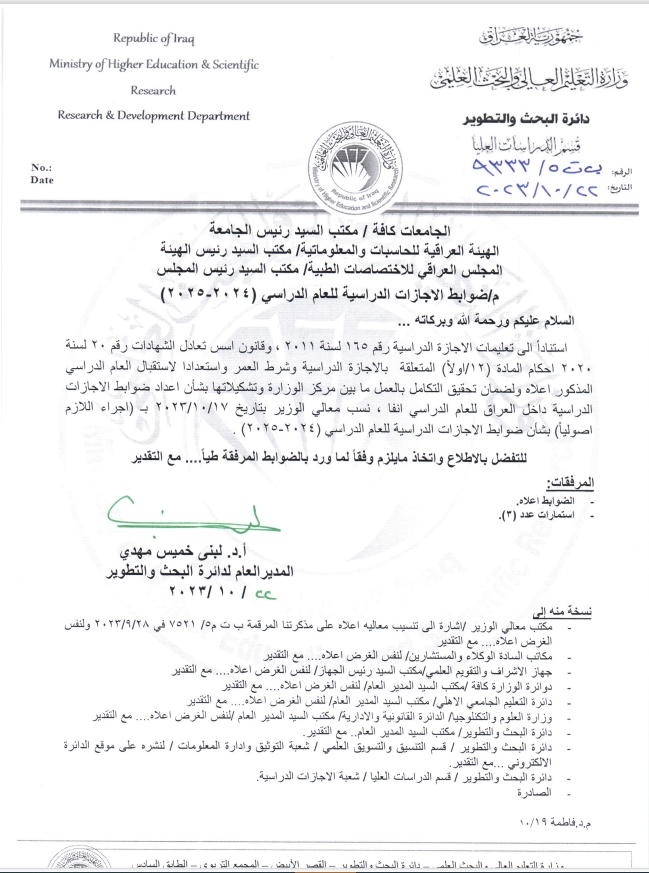 اعلان ضوابط التقديم للدراسات العليا داخل العراق ونشر ملفات خطة الإجازات الدراسية